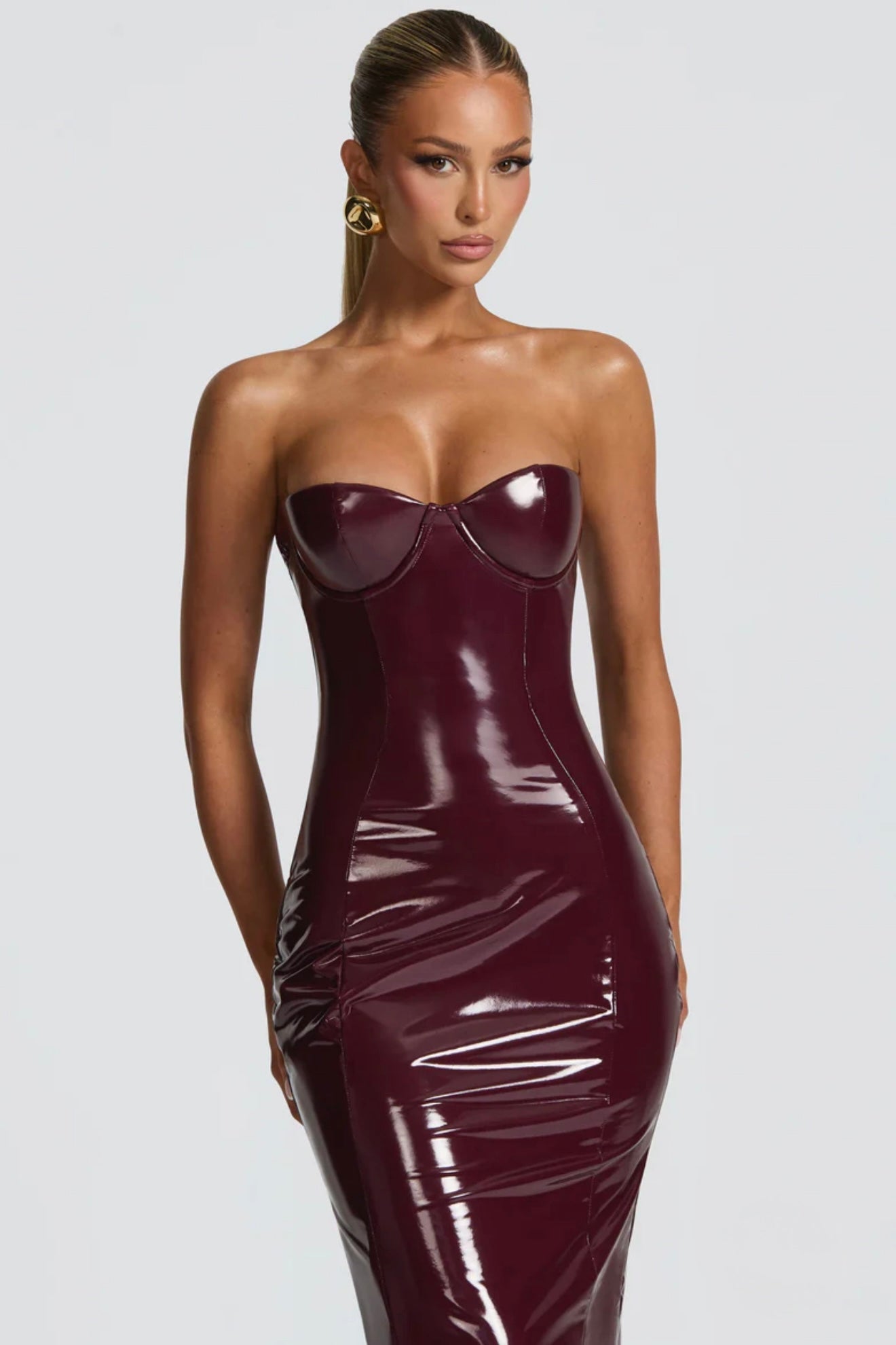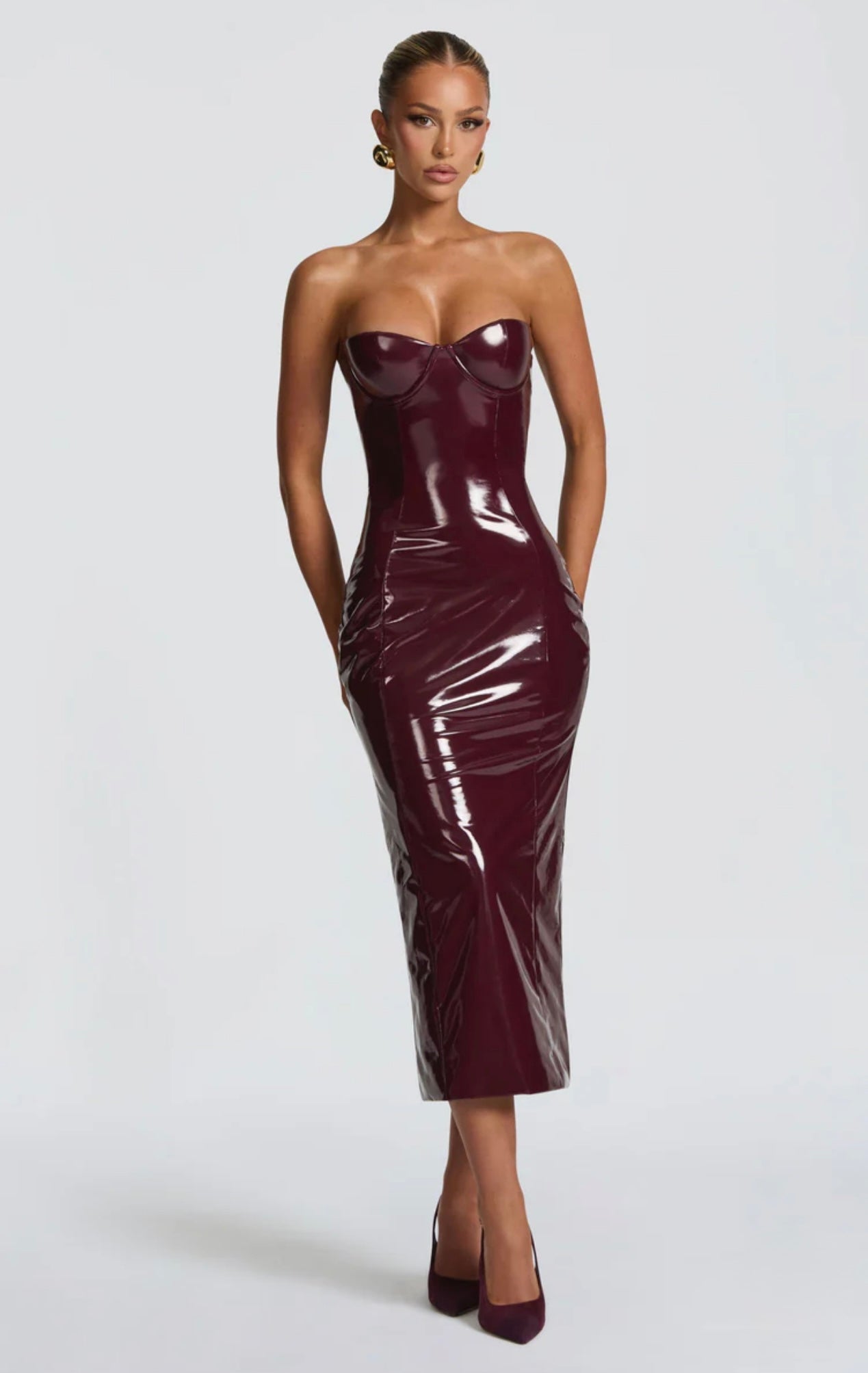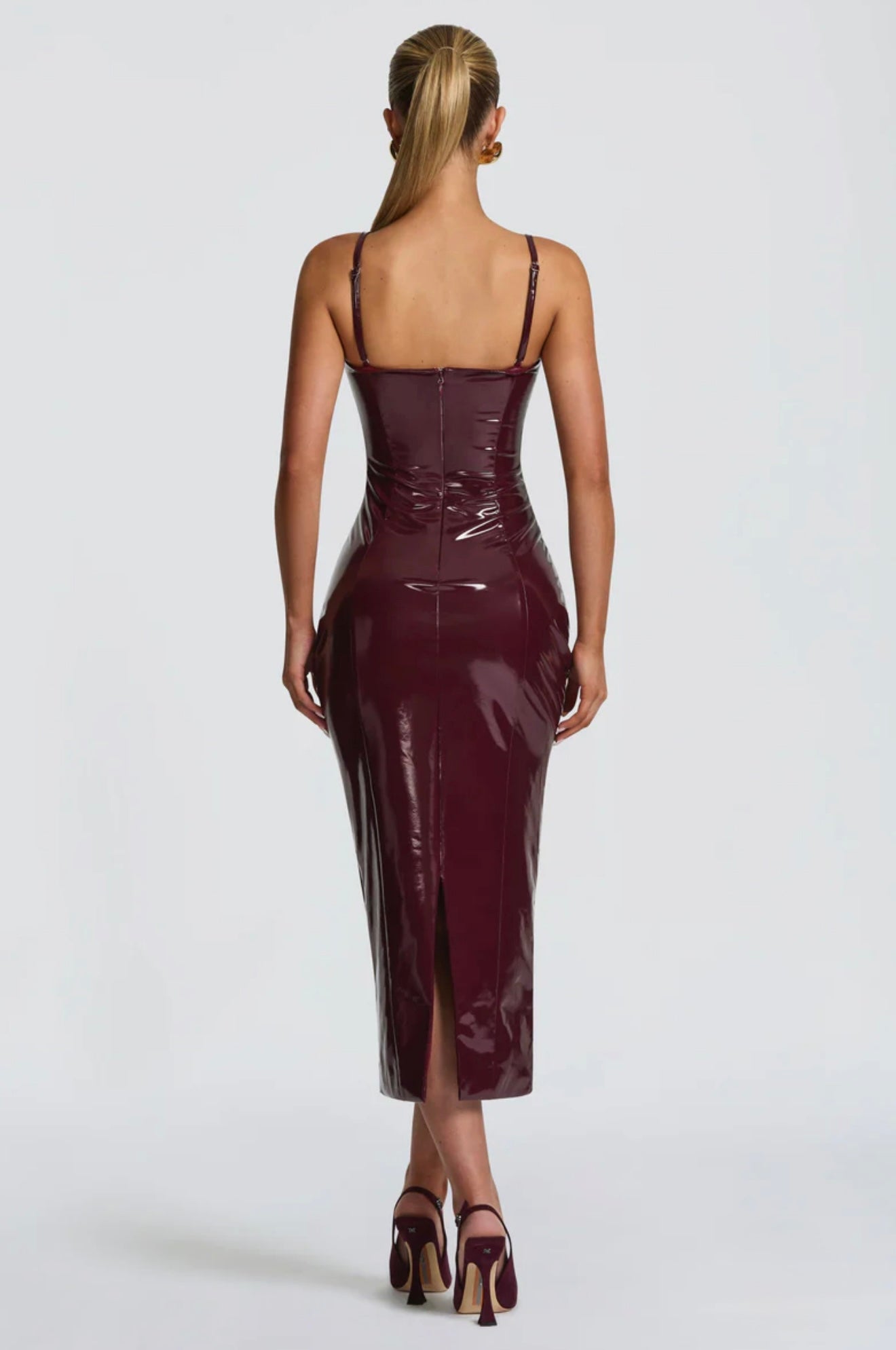 Elevate your look with the Amala Midi Dress in Cherry Lacquer. Crafted from high-shine vinyl, this body hugging dress features underwired cups and detachable straps for tailored support. Shaped princess seams and a centre back split enhance its contoured silhouette.