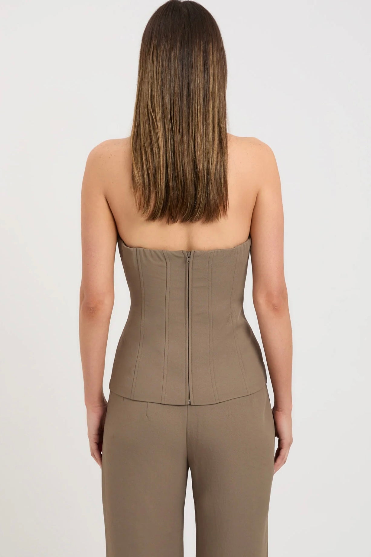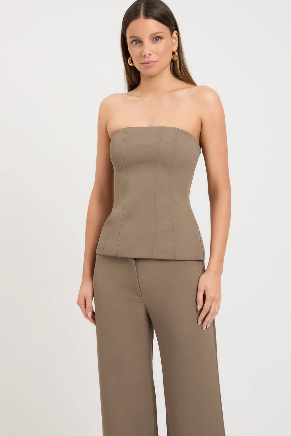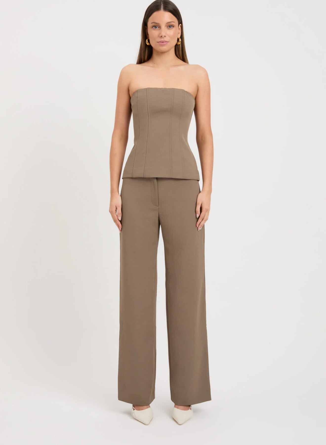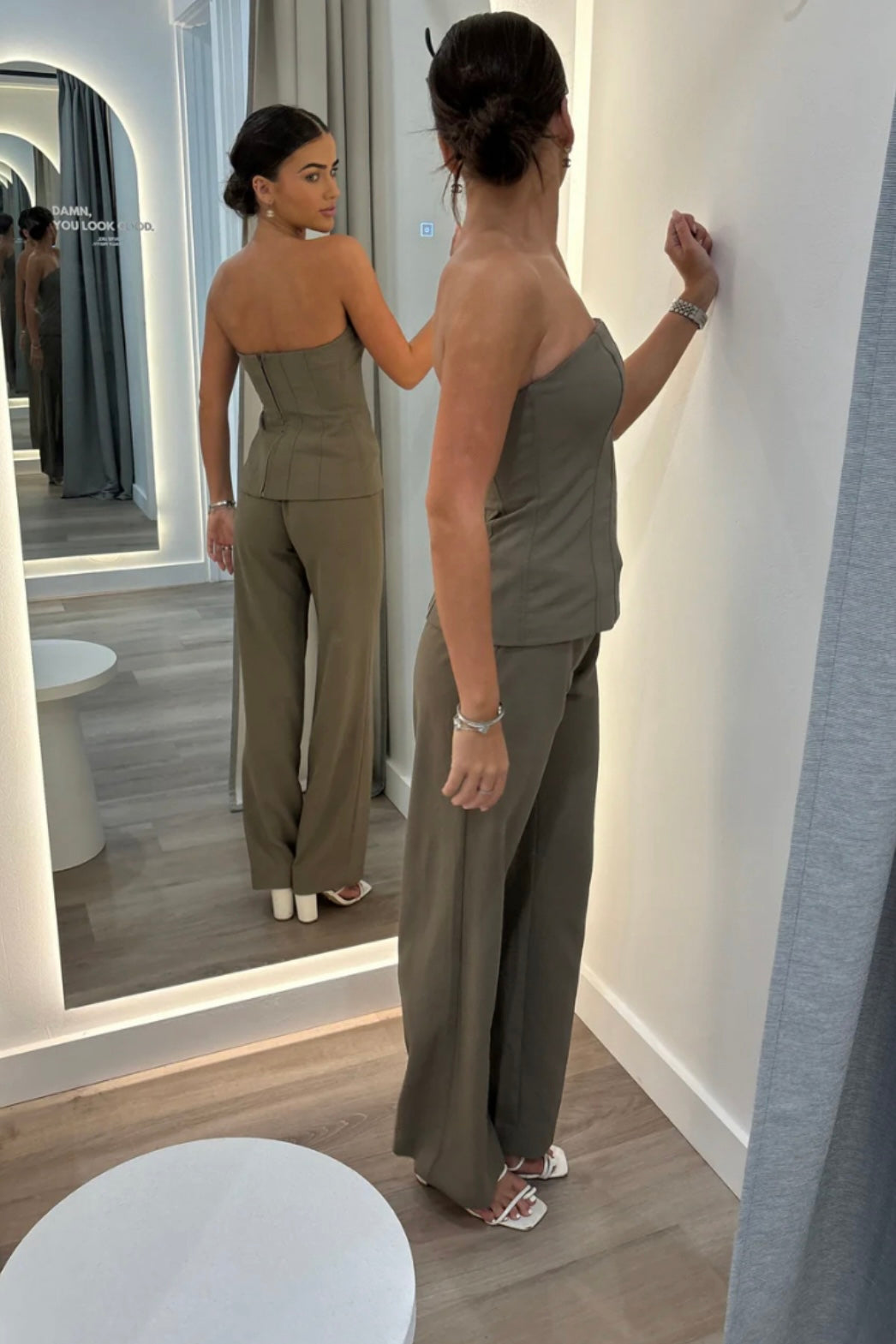 Elegant and effortless, the Ariel Set by Kookai is a modern classic. This tailored two-piece features a structured, strapless corset-style top with seam detailing and a matching high-waisted wide-leg pant that elongates the silhouette. Crafted in Khaki Green, it’s perfect for bridal showers, birthday celebrations, and elevated daytime events. Add a statement heel and you’re good to go – minimal yet major.