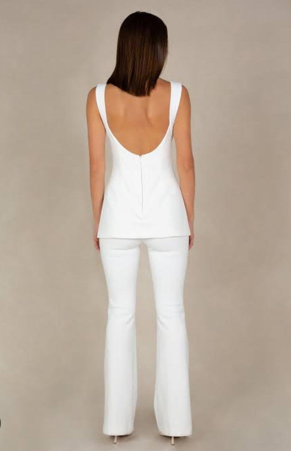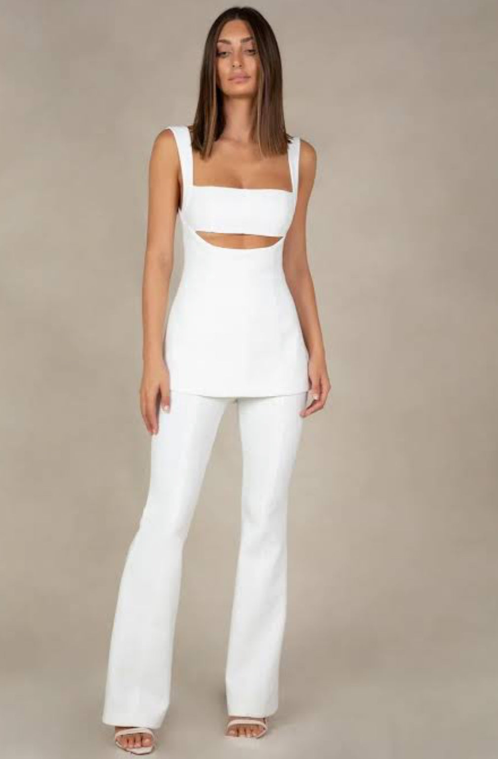 Chic, elevated, and sold out everywhere—the Costanza Playsuit by Misha Collective is the ultimate modern power piece. Featuring a sculpted square neckline, statement cut-out under the bust, and a tailored flared pant, this all-white design redefines contemporary elegance. Crafted from structured stretch crepe, it cinches the waist while contouring the body for a flattering silhouette. Perfect for bridal events, luxe lunches, or fashion-forward functions—this playsuit is a must-rent moment that blends confidence with class.