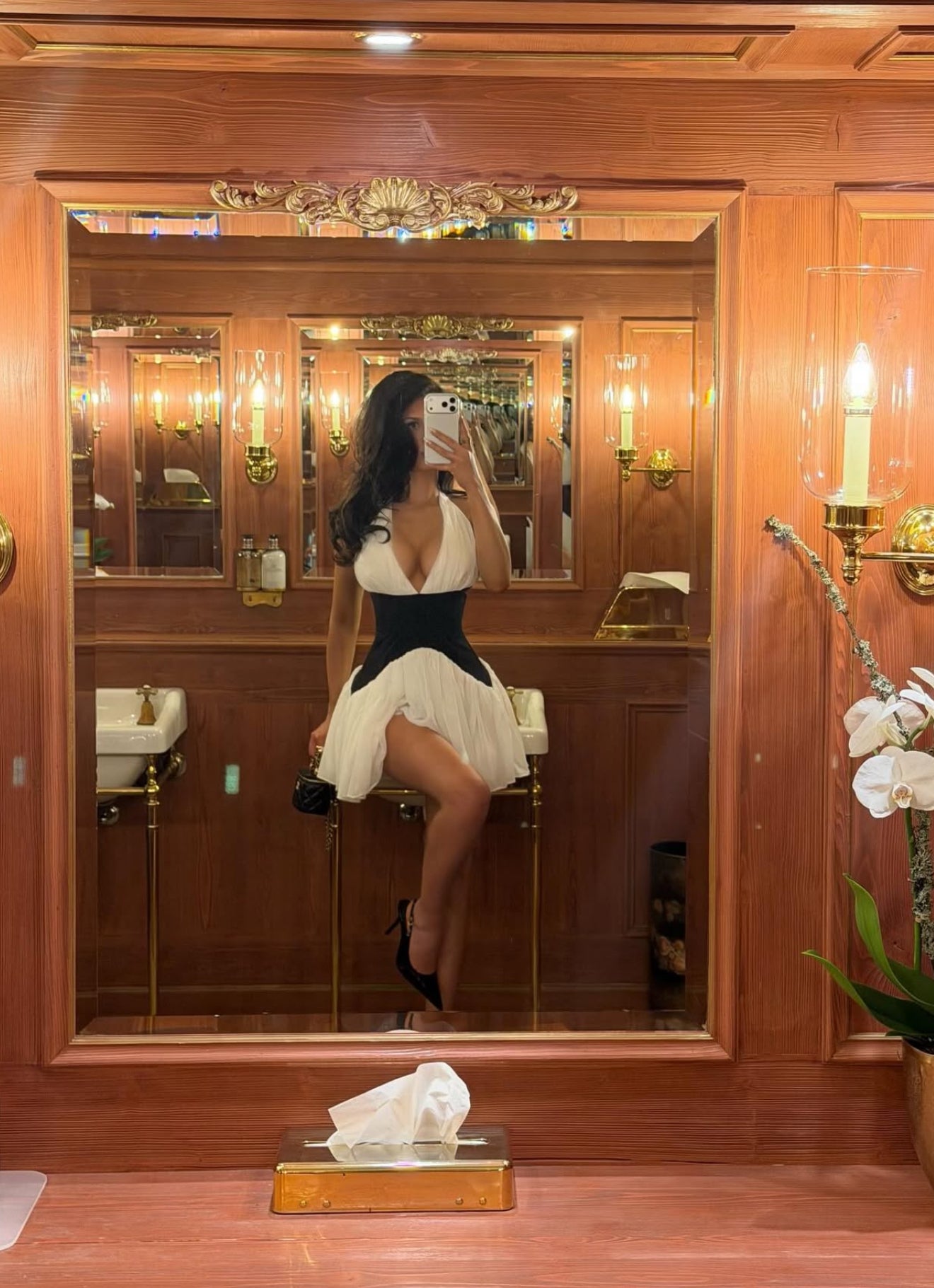 A modern masterpiece where romance meets structure. This white halter mini dress features our signature black corset waist that sculpts and defines your silhouette. Crafted from luxurious premium chiffon, the delicate gathering at the halter neckline and below the corset creates effortless movement and texture. The structured black corset waist provides striking contrast while emphasizing your natural curves. This investment piece seamlessly transitions from cocktail parties to special events - your go-to for making an unforgettable statement season after season.