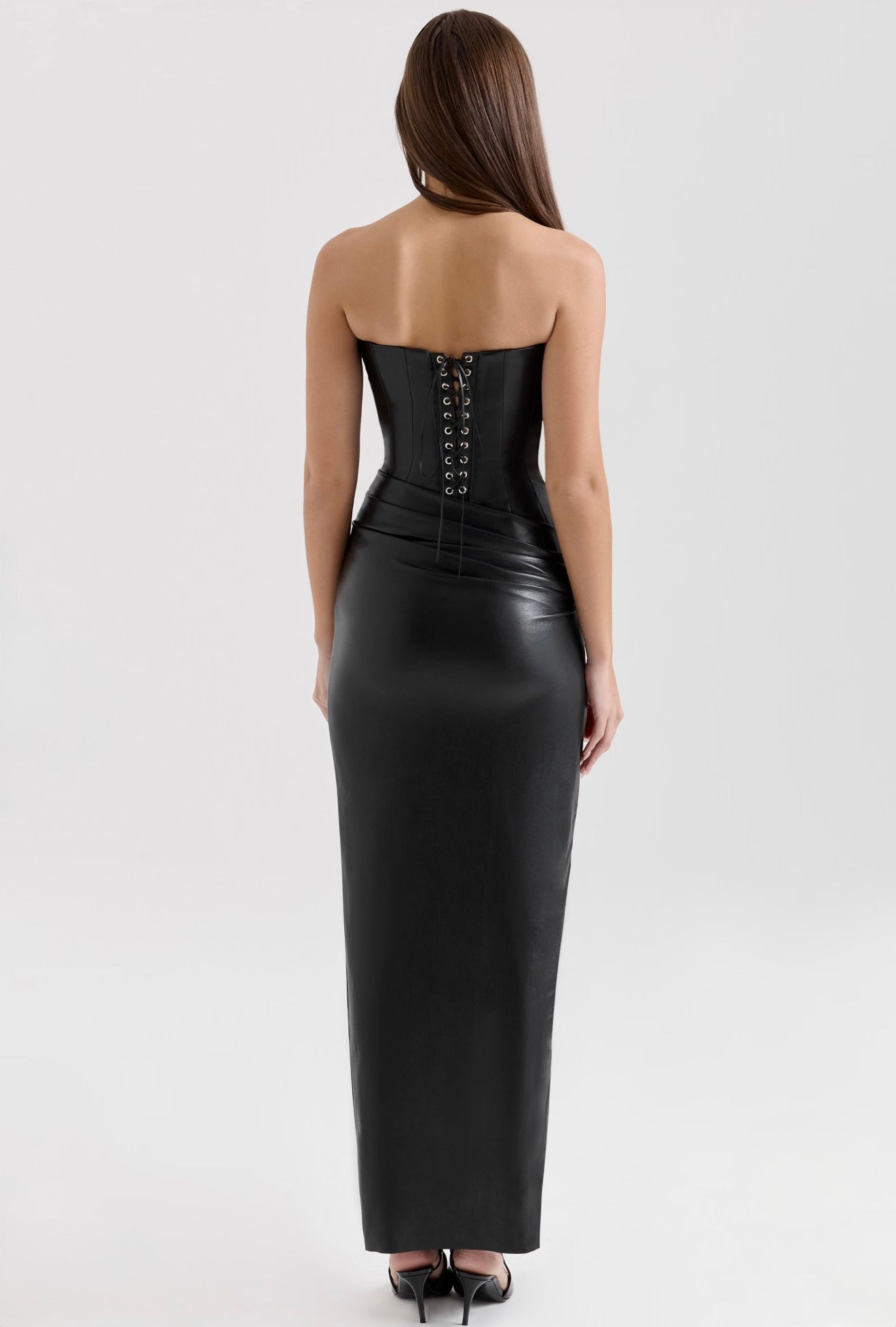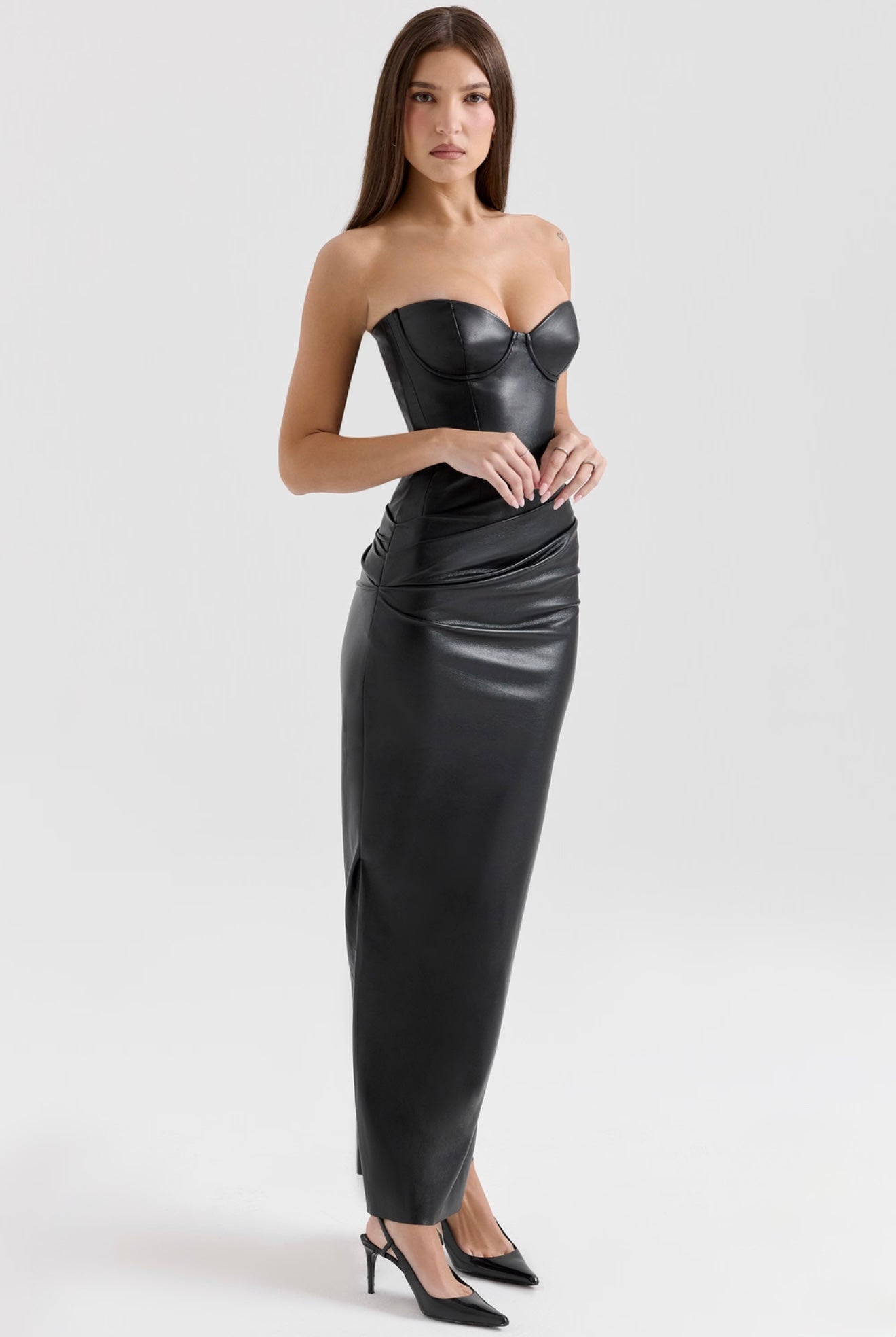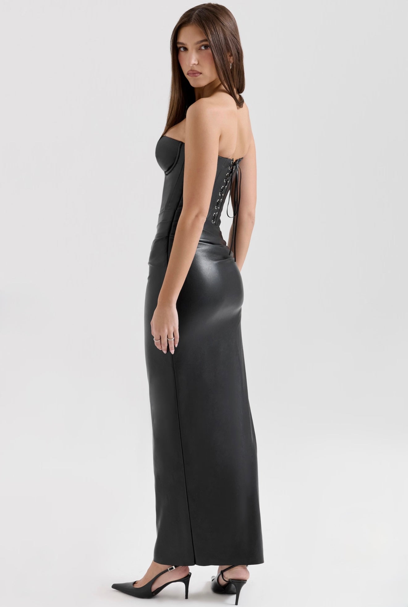 Sleek, striking, and effortlessly sexy—the Juliana Black Maxi by House of CB is the definition of modern elegance. Designed with a curve-contouring fit, this strapless gown features a structured corset bodice and a dramatic thigh-high slit. Crafted from faux leather, it sculpts the body in an hourglass. Perfect for black-tie events, birthdays, or any moment that calls for a bold entrance.
