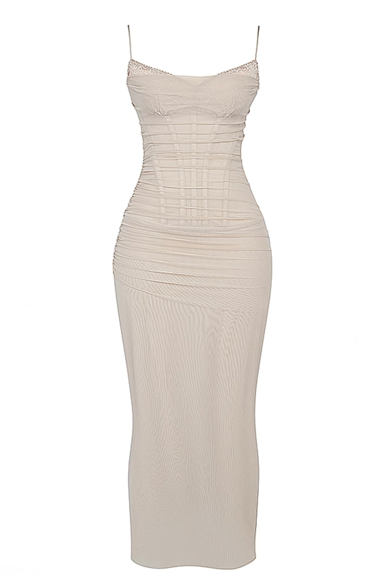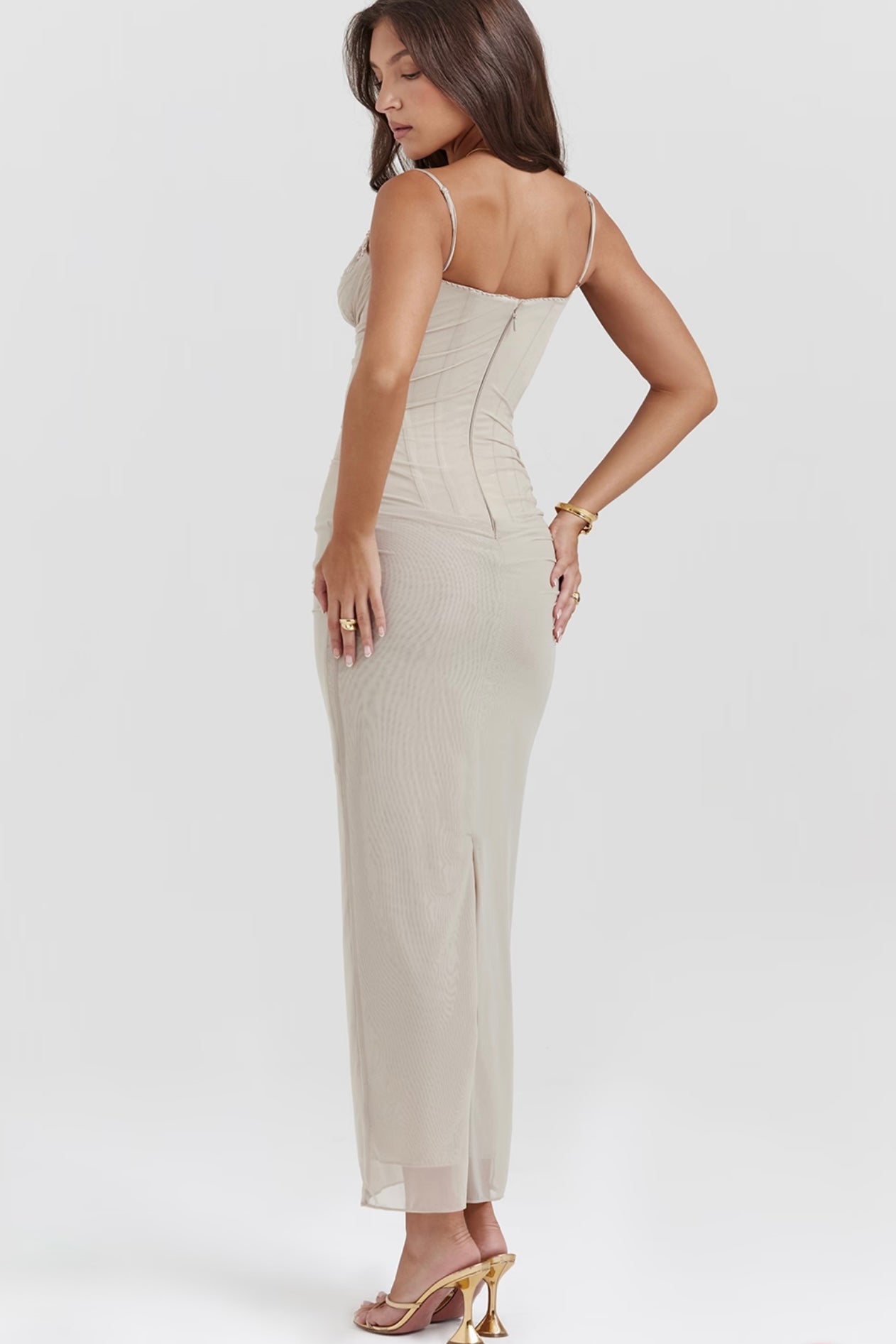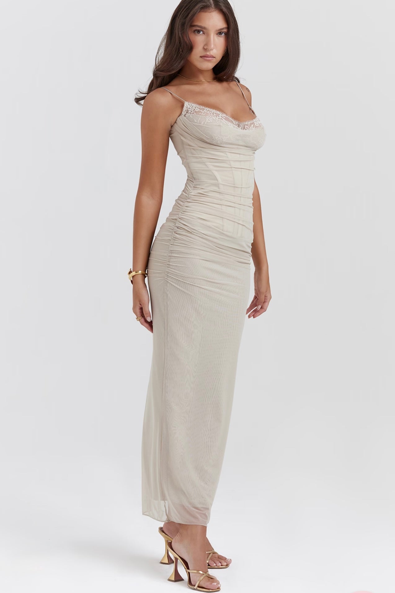 The Nalani Dress is the definition of understated luxury. Designed in a delicate soft beige mesh with lace-trimmed cups and signature corsetry, this gown effortlessly hugs your figure for a sculpted, hourglass shape. It’s timeless, feminine, and made to leave a lasting impression.