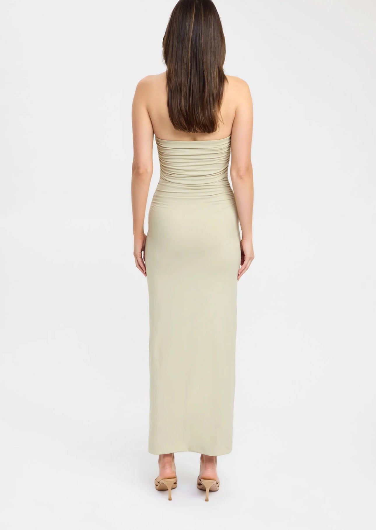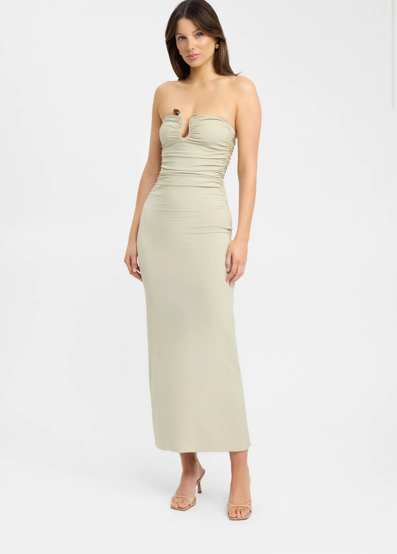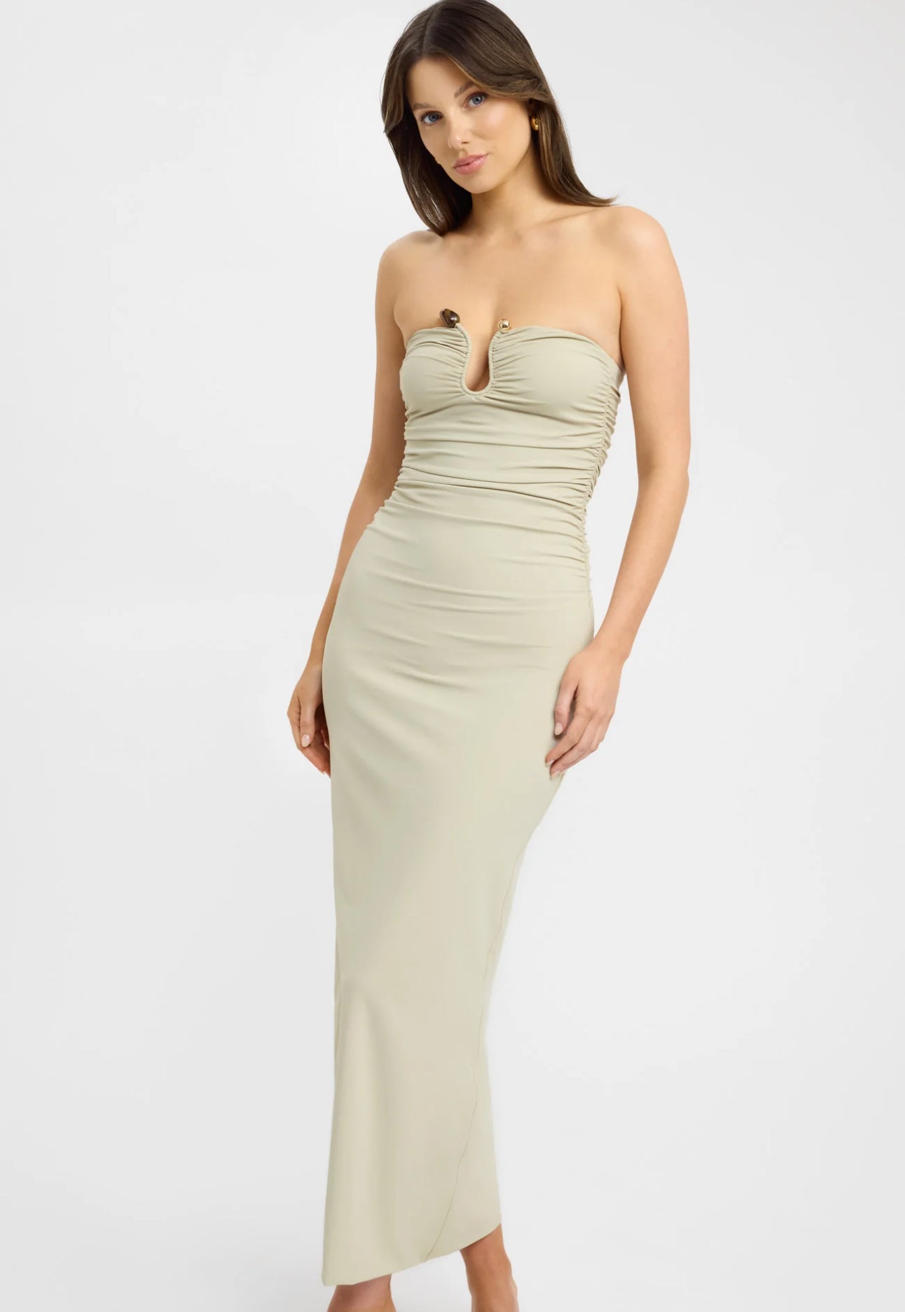 Elevate your evening look with the Tayla Trim Maxi, a striking silhouette that blends elegance with a touch of daring. Crafted from a figure-sculpting stretch fabrication, this strapless dress features flattering ruching along the bodice and hips to enhance your curves. The signature gold-tone U-bar detail at the neckline adds a bold, sophisticated accent, while the soft neutral hue keeps it effortlessly timeless. With a bodycon fit that flows into a straight-line maxi hem, the Tayla is perfect for cocktail soirées, formal dinners or any occasion where turning heads is a given.