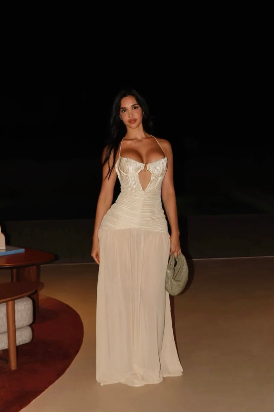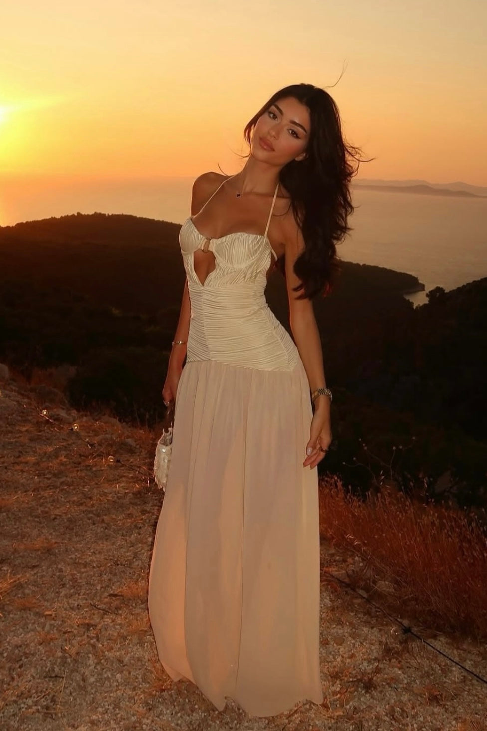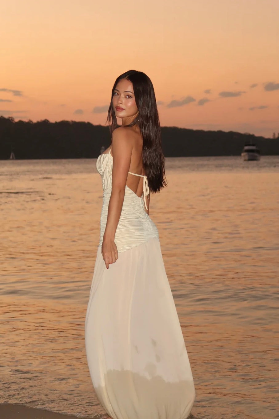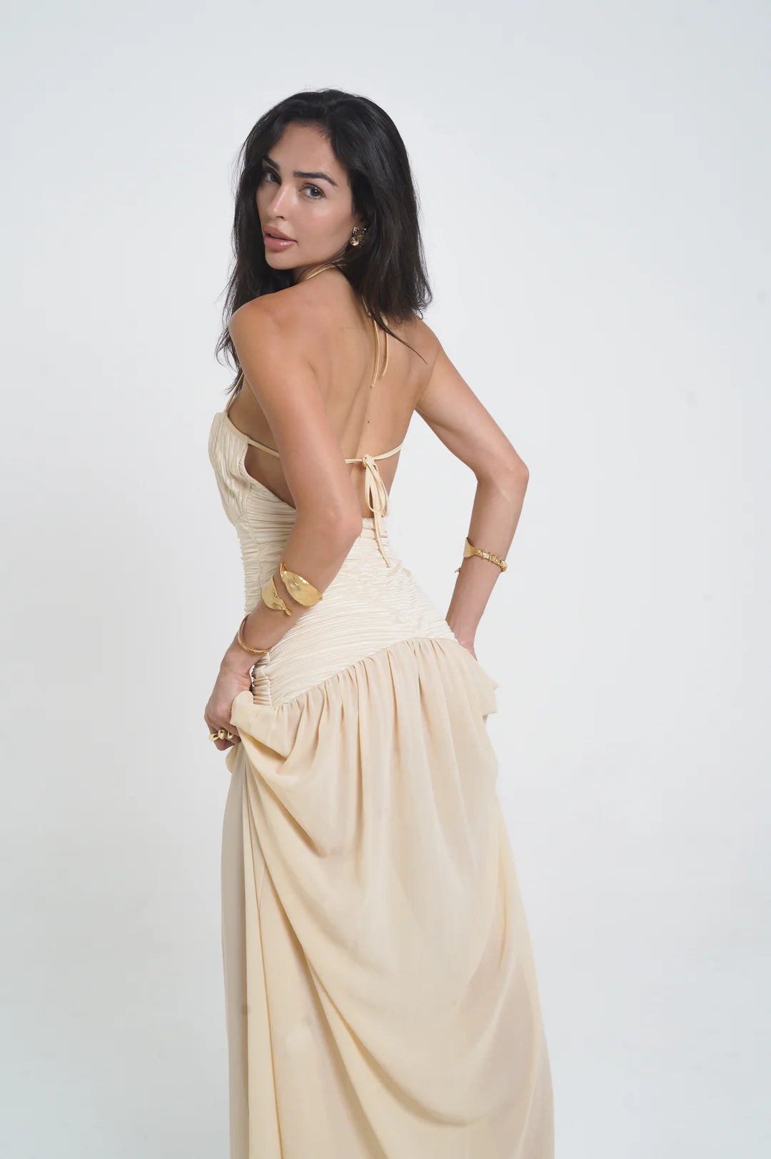 Radiate elegance this summer in our Celeste Dress. Featuring a pleated bodice that offers a refined, textured look beautifully contrasting the soft sheer flowing skirt. In a stunning gold tone this dress catches the light with every movement giving you a radiant glow. Designed to offer both comfort and style, this dress is a must have for those seeking effortless elegance.