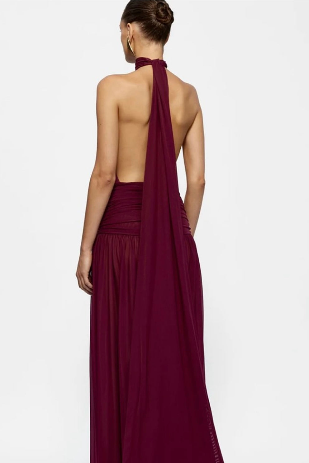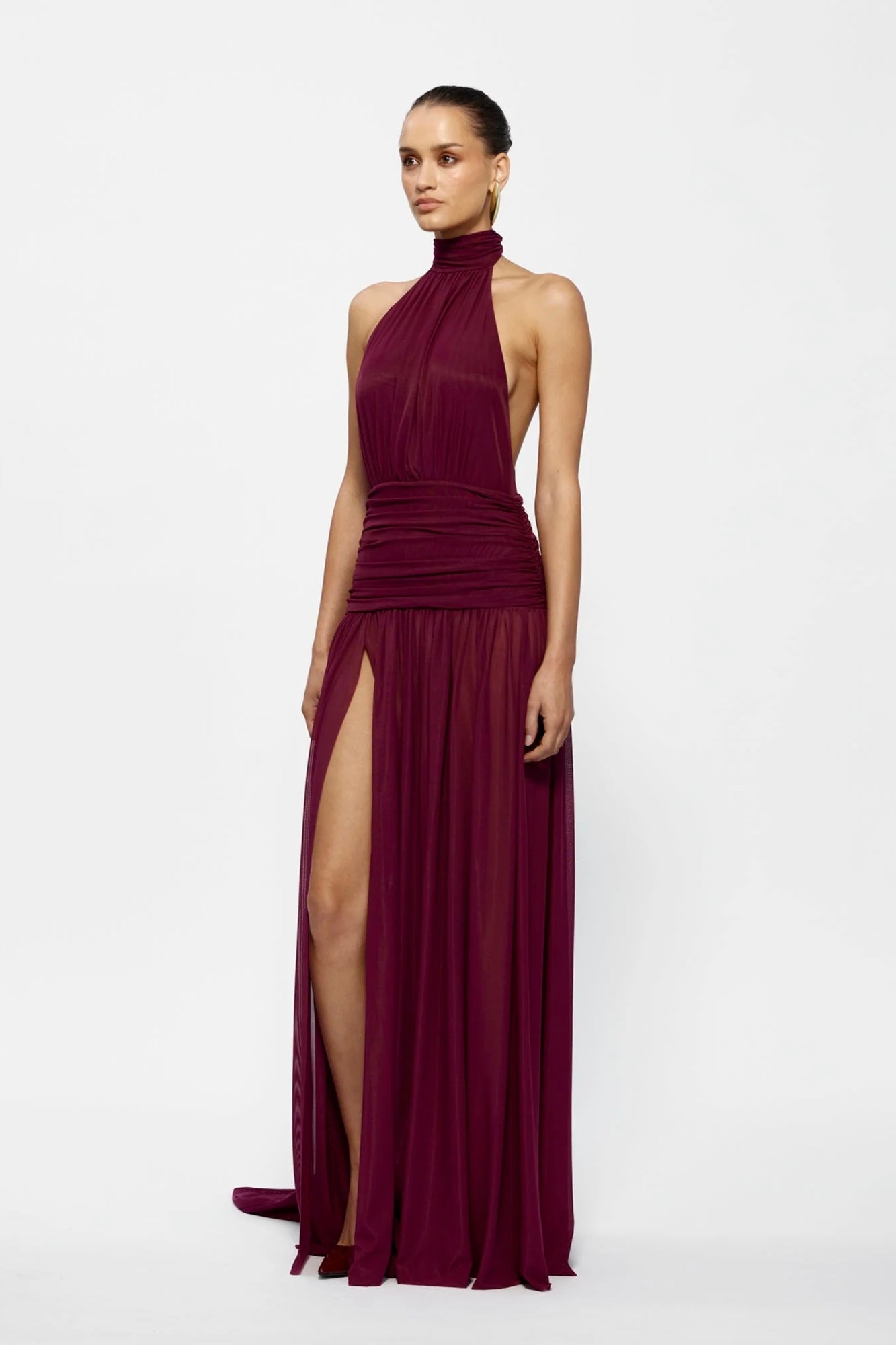 Introducing the Verity Gown, a romantic blend of sensual allure and vintage charm. Crafted from our soft and buttery mesh that beautifully flows and drapes across the body. The Verity Gown focuses on flattering the feminine form, featuring a halter style neckline that blends seamlessly into a full length maxi skirt. Intricately detailed with ruching and texture along the bodice, Verity features a gorgeous open-back with a plunging train along the back of the silhouette. Made to be a timeless classic, to be worn for seasons to come. Made to be slightly sheer.